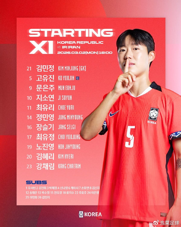 本场比赛,韩国女足主帅申相又排出了4141的阵型,去年联赛MVP老将崔有廷担任单中锋,中场由崔宥利、文恩珠、池笑然和姜綵林一字排开,单后腰为郑敏煐,四名后卫从左到右为张瑟琪、卢镇永、高瑜珍和金惠利组成,这条后防线中,郑敏煐、卢镇永、高瑜珍都是首次参加亚洲杯的赛事。门将位置由参加了法国女足世界杯的金珉贞担任。从首发来看,韩国女足将崔有廷、崔宥利、池笑然和姜綵林四大攻击手集体派上场,也彰显了他希望韩国女足抢下开局的决心!
