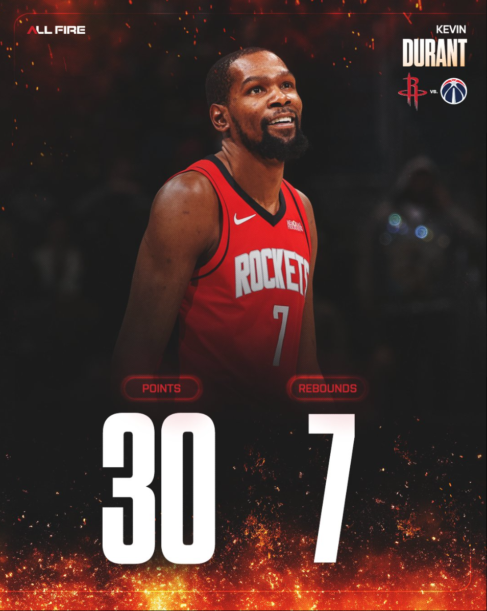 此役后杜兰特完成多项里程碑:1.杜兰特连续三场30+成为火箭队史最年长球员;