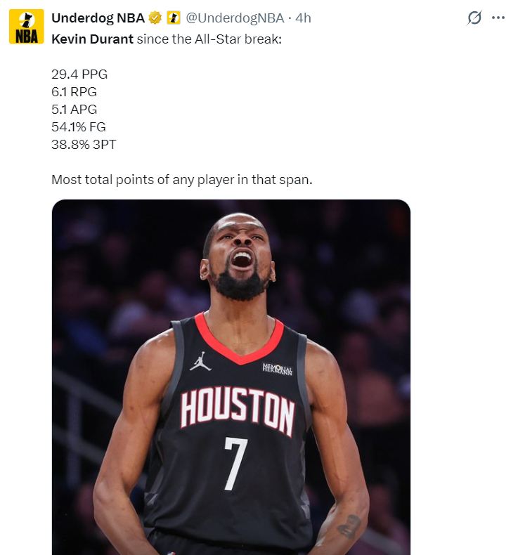 在全明星周末后,杜兰特场均29.4分6.1篮板5.1助攻,命中率54.1%,三分命中率38.8%;