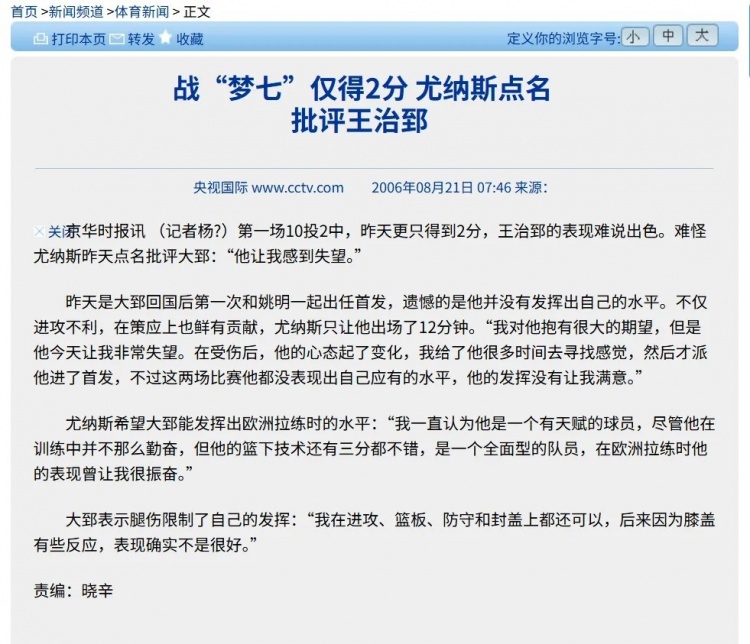 第二场打美国,中国队没有悬念的输掉,王仕鹏拿到全队第二高的17分,王治郅首发11分钟只得2分,赛后王治郅被尤纳斯揪出来当典型批判,说王治郅“训练不那么勤奋,表现让我失望”
